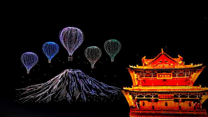 随后,云冈石窟的庄严佛像以立体形态悬浮夜空,衣袂飘动的细节较暑期表演更显灵动;马背上的花木兰持剑而立,飒爽英姿掠过天际,再现边塞文化印记。最令人惊喜的新增图景中,火山锥形轮廓铺展后,多彩热气球集群从 “火山口” 冉冉升起,精准还原了 8 月全国热气球锦标赛的盛况;大同南站的现代化轮廓与东风 —5C 导弹的硬核身影交替出现,古今碰撞的视觉效果令人目不暇接。据主办方介绍,后期展演还将加入《黑神话:悟空》悟空形象及嫦娥、玉兔等中秋元素。